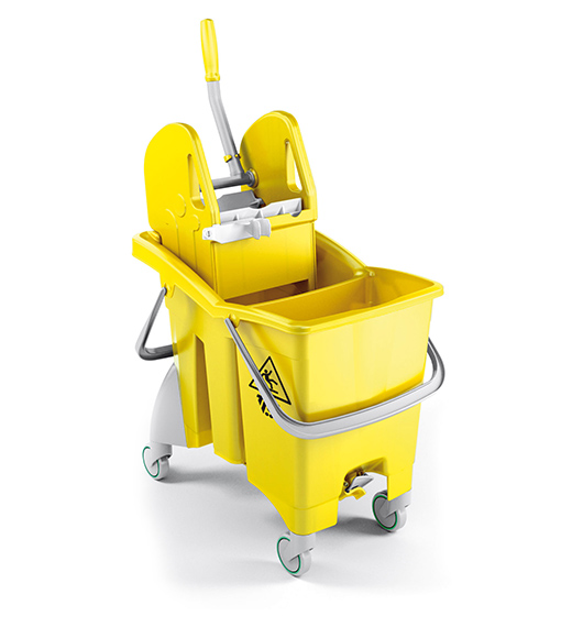 TTS sempre atenta as exigências específicas dos operadores da limpeza, idealizou um novo balde, ACTION PRO, com duas bacias, ambas equipadas com escape para água, um atrás e outro na frente, completos de sistema de vedação e uma alavanca para fechar e abrir o escape da água. O balde tem uma capacidade total de 30 L divididos entre solução quimica e água de enxágue. A bacia frontal, que leva a solução química, é dotada de escala graduada em litros e em galões para facilitar a dosagem de água e solução detergente. Ideal para lavagem profissional.
